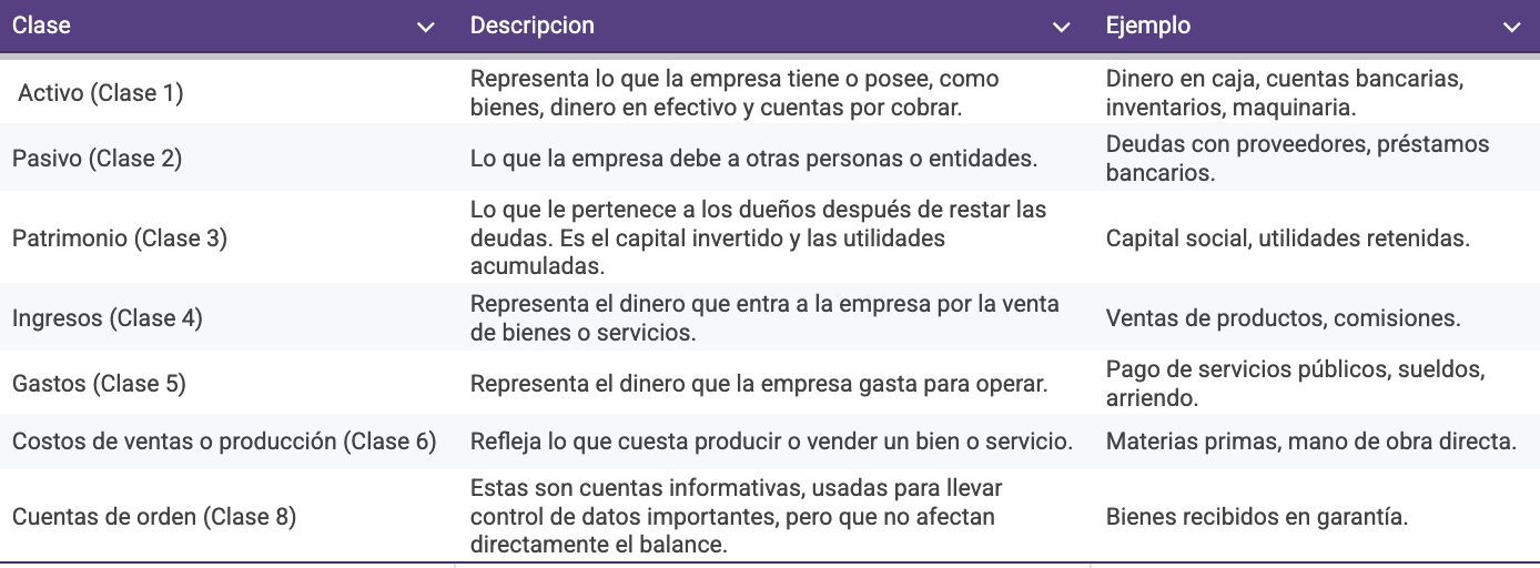 Las cuentas contables están organizadas de manera jerárquica, siguiendo una estructura que va de lo más general (clase) a lo más específico (subcuenta). Así, se detalla cada movimiento financiero con precisión.