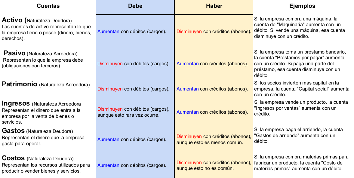 - Deudora: Aumenta con un débito (carga) y disminuye con un crédito (abono).