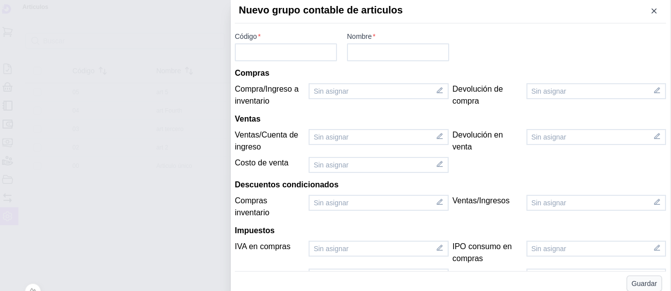 - Grupo contable: Se elige el grupo contable del artículo, el cual define las cuentas del PUC (Plan Único de Cuentas) donde se registran los movimientos contables