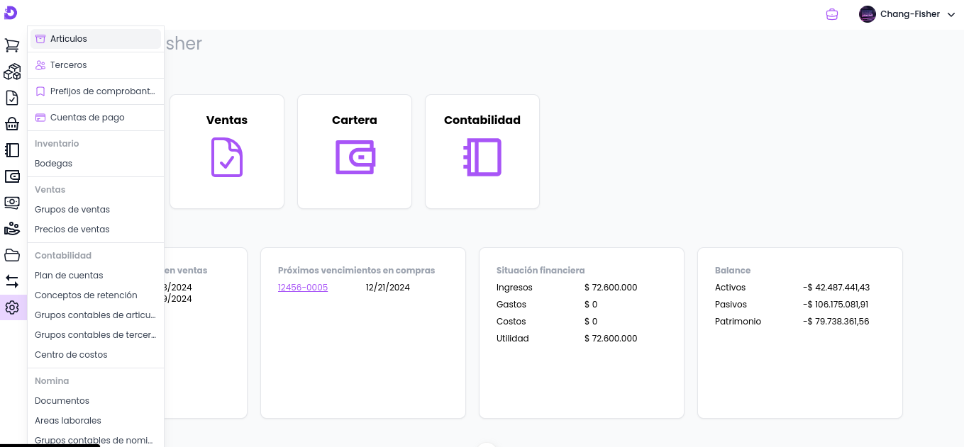 Se puede acceder a la opción de creación de Artículos ingresando a la unidad de negocio a gestionar, en la barra de menú, a través del botón Configuración y la opción Artículos.