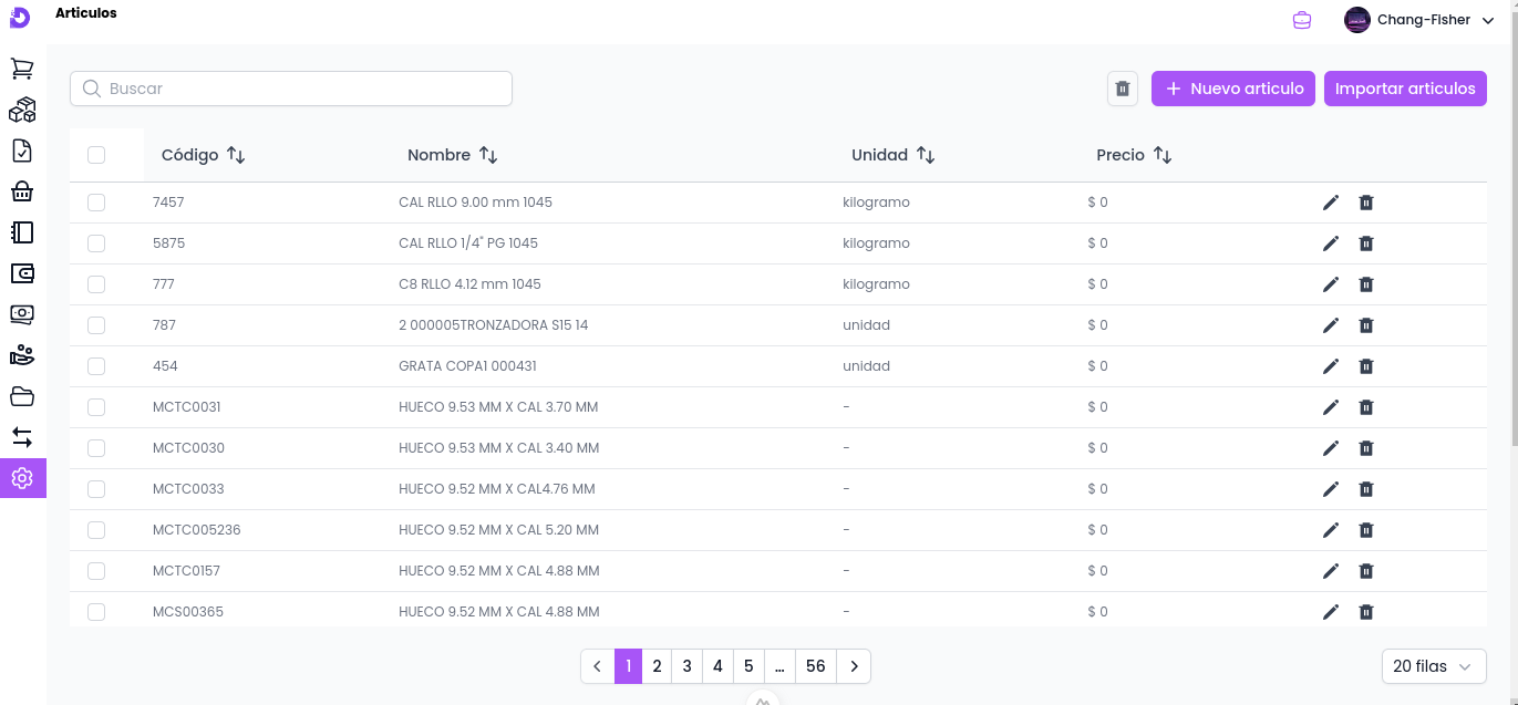 Al seleccionar la opción Artículos , se muestra una lista con los artículos disponibles, junto con sus datos básicos y opciones para editar, eliminar y filtrar, facilitando su gestión.