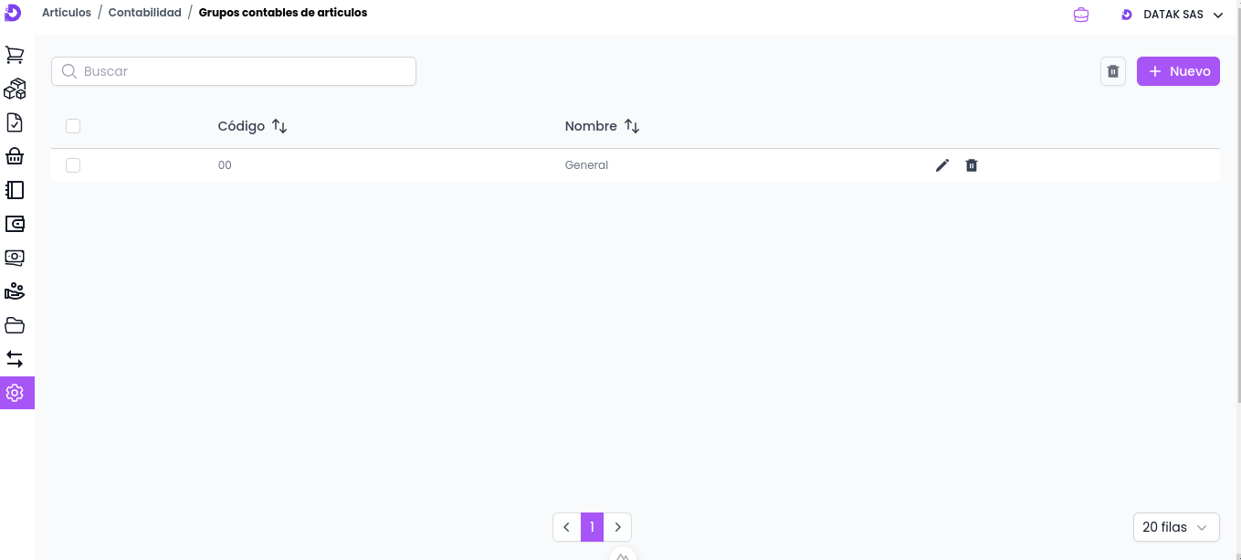 Para crear un nuevo grupo contable de artículos, haz clic en el botón Nuevo, ubicado en la parte superior derecha de la pantalla Grupos Contables de Artículos.