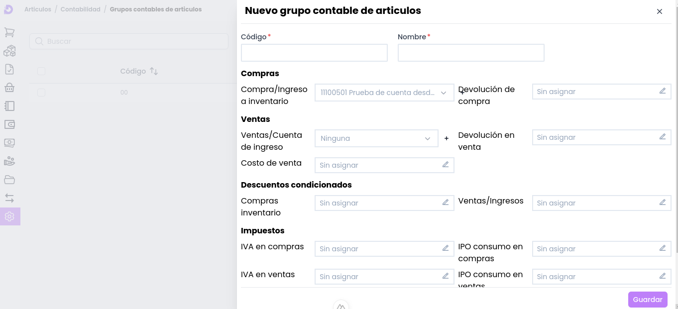 - Nombre: Nombre que identifica el grupo contable de artículos. Se recomienda que sea corto y preciso para mejorar la experiencia de búsqueda