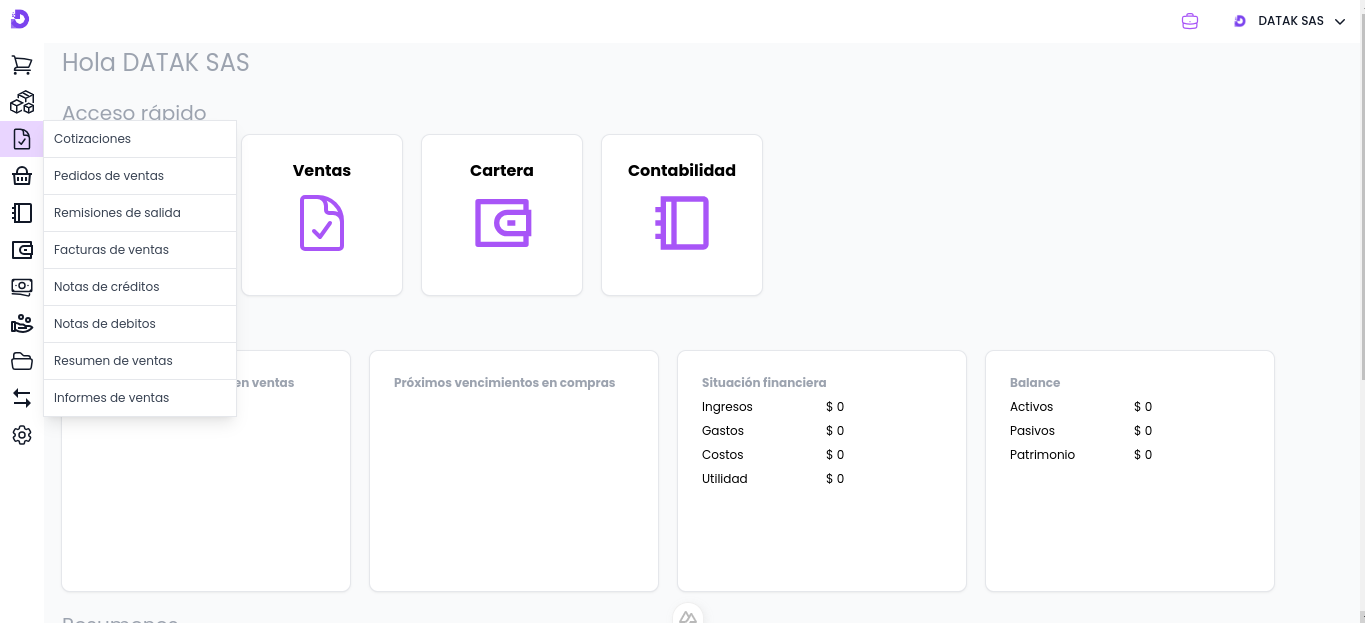 Se puede acceder a la opción de Notas de debito al ingresar en la unidad de negocio a gestionar, en la barra de menú, sobre el botón Ventas y seleccionando la opciónNotas de debito.