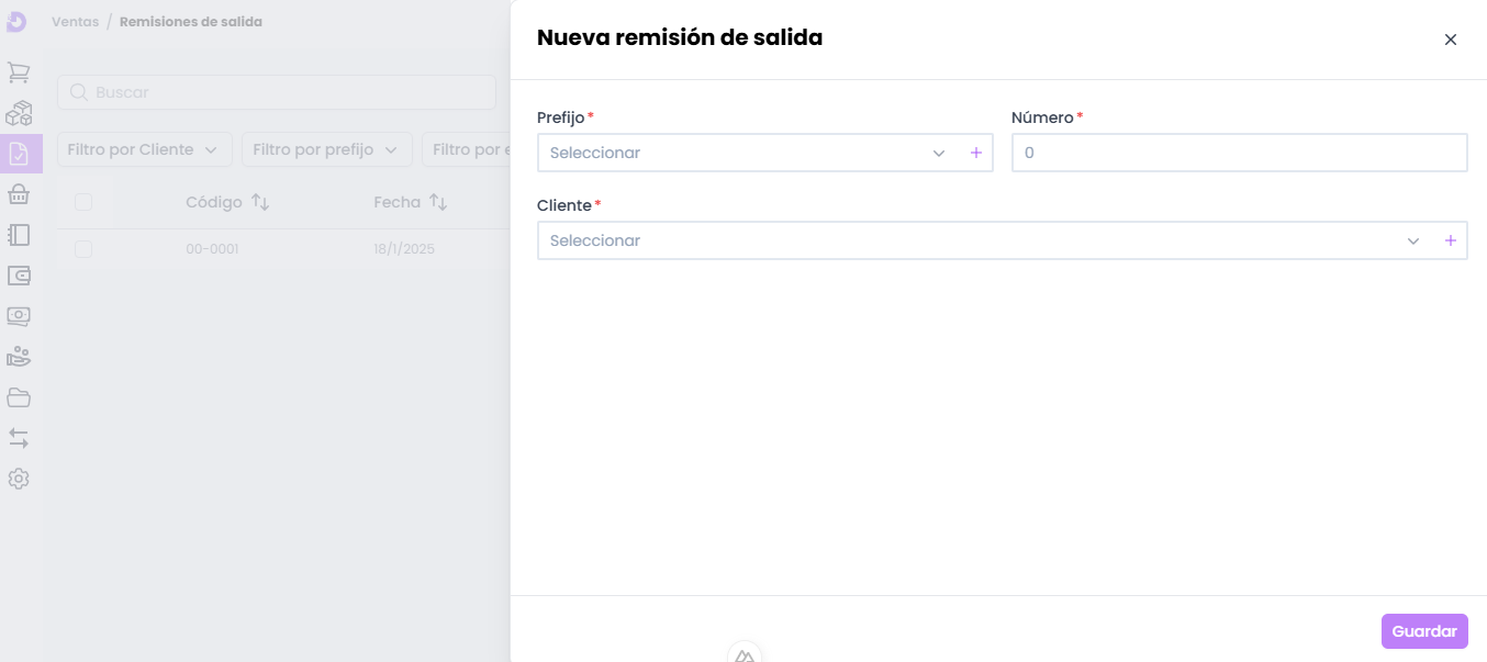 - Cliente: Selección o registro del Cliente al que va dirigido el documento de Remisión de salida.