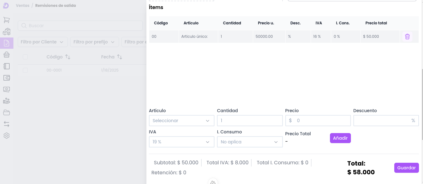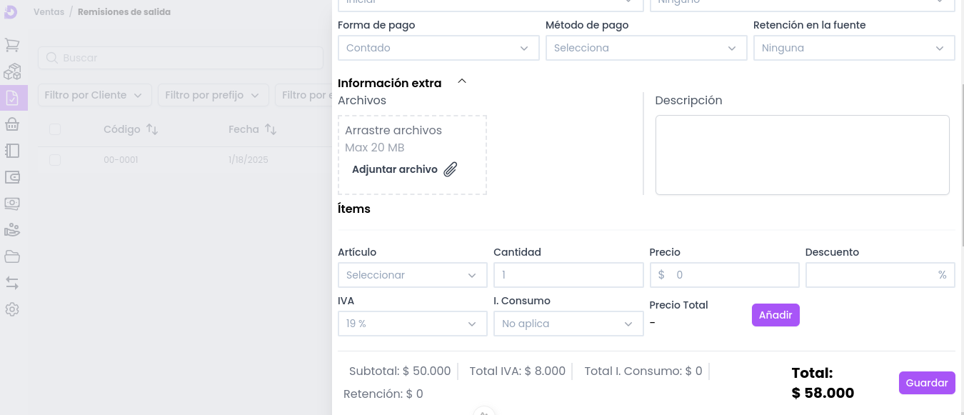 - Total: Cálculo final del documento de Remisión de salida, que incluye subtotal, impuestos y retenciones.
