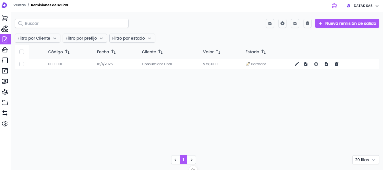 Al ingresar, se mostrará una lista de los documentos de Remisiones de salida creados, con sus datos básicos y opciones para editar, eliminar y filtrar, facilitando su gestión.