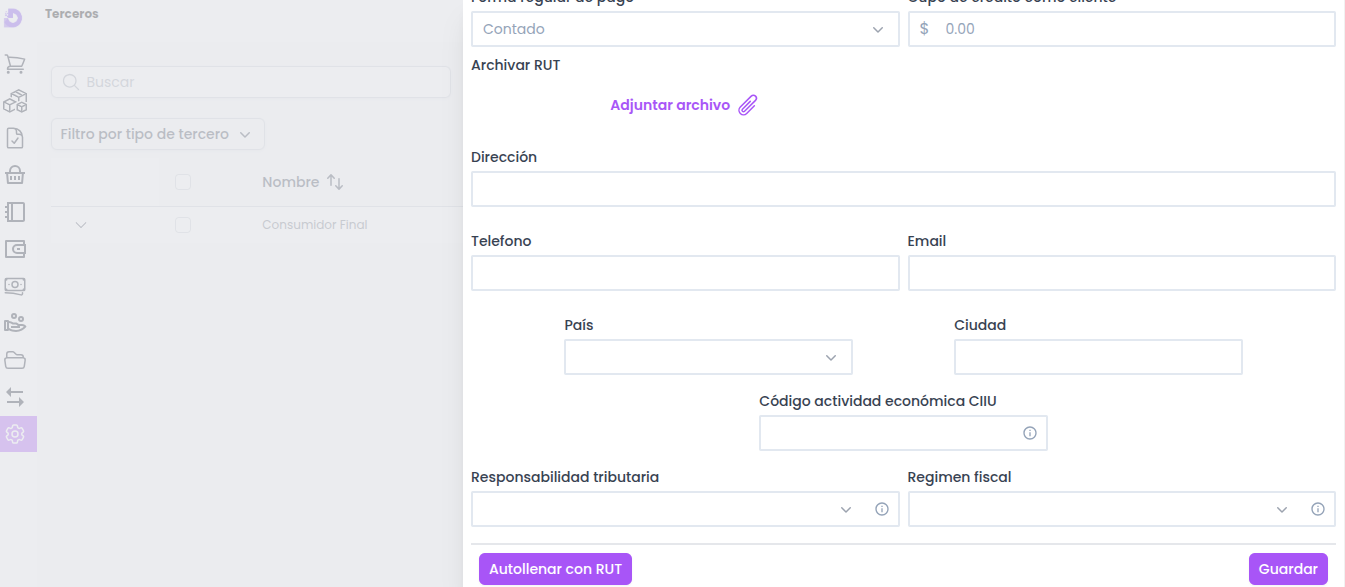 - RUT: Permite adjuntar una copia del RUT del tercero para facilitar la gestión documental y agilizar procesos administrativos.