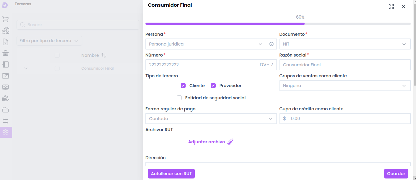 - Tipo de tercero: Permite elegir uno o varios tipos de terceros para identificar si es cliente, proveedor, etc., facilitando su filtrado en las funcionalidades del sistema
