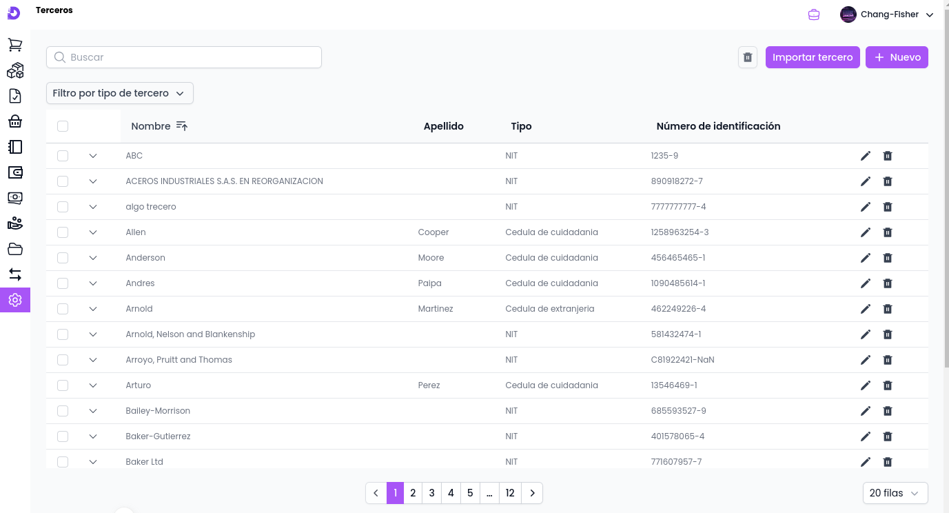 Al acceder a la opción de Terceros , se mostrará una lista con los terceros disponibles, incluyendo sus datos básicos y opciones para editar, eliminar y filtrar con el fin de gestionar eficientemente los registros creados.