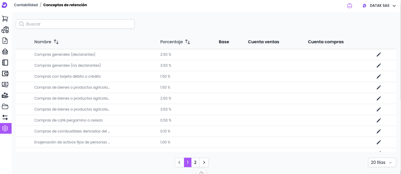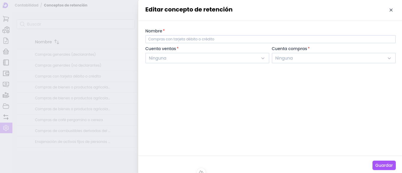 En la opción Editar, podemos seleccionar las cuentas en las cuales se registran los movimientos de estos conceptos, tanto en compras como en ventas.